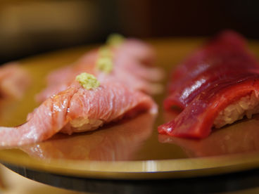 To draw out the inherent deliciousness of our ingredients, each is meticulously aged for its optimal duration. Then, alongside our meticulously prepared akazu (red vinegar) sushi rice, brewed using time-honored traditional methods, our seasoned artisans lovingly craft each and every piece with heartfelt dedication.